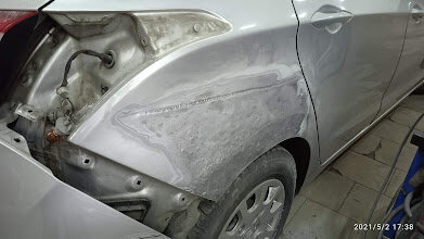 Устраняли дыру в крыле Соляриса. Мастер заварил дырку, покрасил локально крыло, бонусом подправил бампер. Цены средние, можно найти дешевле, но качество работ на хорошем уровне.